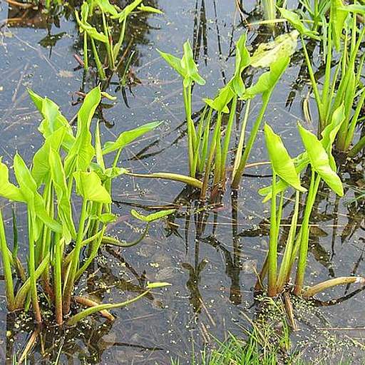 Peltandra Virginica, commonly known as Green Arrow-arum, is a native aquatic plant of the arum family that can be found in wetlands in the eastern United States, as well as in Quebec, Ontario, and Cuba. It is tolerant to low oxygen levels and is easily grown in standing water to 6" deep in full sun to part shade and may also be grown in consistently moist boggy soils. P. virginica does not colonize as aggressively as similar plants and reproduces via seed or division. It is pollinated by a chloropid fly through providing a brood site and releasing pollen onto them, as well as by water and animals. The leaves are variable in shape and size, but are often generally arrowhead-shaped.
