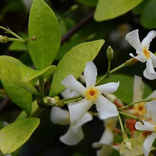 Trachelospermum, also known as Confederate jasmine or star jasmine, is a genus of evergreen woody vines in the dogbane family Apocynaceae. Native to southern and eastern Asia, these plants have long stems that can climb up to 12 meters or more in trees. The leaves are opposite, simple, and range from broad lanceolate to ovate, measuring 2–8 cm in length and 0.5–4 cm in width. The flowers, which resemble those of Phlox, are salverform and measure 2.5–7 cm in diameter. They have five white, pale yellow, or purple petals that are joined at the base to form a tube. Despite its common name, Trachelospermum is not a "true jasmine" and does not belong to the genus Jasminum.